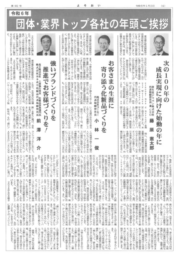 「ビジョン2030」「推進戦略」で日本の化粧品の魅力を発信 日本化粧品工業会 会長 魚谷 雅彦 1月1日に発生した「令和6年能登半島地震」により、亡くなられた方々に謹んでお悔やみ申し上げるとともに、被災された方々に心から […]