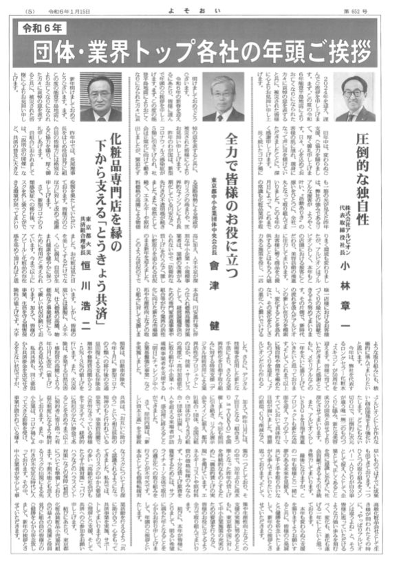令和6年 団体・業界トップ各社の念頭ご挨拶 圧倒的な独自性 株式会社アルビオン 代表取締役社長 小林 章一 謹んで新年のご挨拶を申し上げます。先ず、この度の令和6年能登半島地震によりお亡くなりになられた方々 […]
