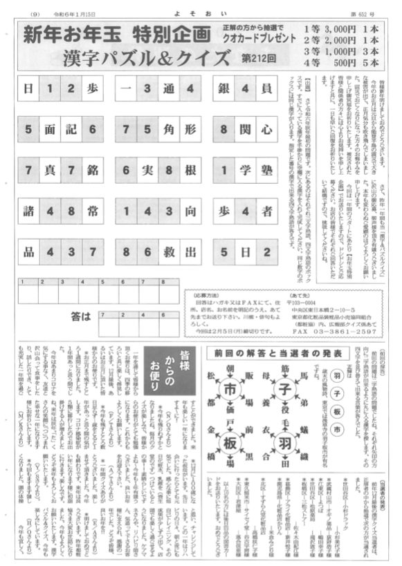 今回は新年お年玉 特別企画 「漢字&パズルクイズ」 第212回 正解の方から抽選でクオカードプレゼント 1等3,000円1本 2等2,000円1本 3等1,000円3本 4等 500円5本 皆様 […]