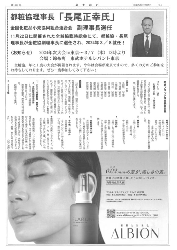 都粧協理事長「長尾正幸氏」 全国化粧品小売協同組合連合会 副理事長選任 11月22日に開催された全粧協臨時総会にて、都粧協・理事長長尾正幸氏が全粧協副理事長に選任され、2024年3/18就任! <お知らせ> […]